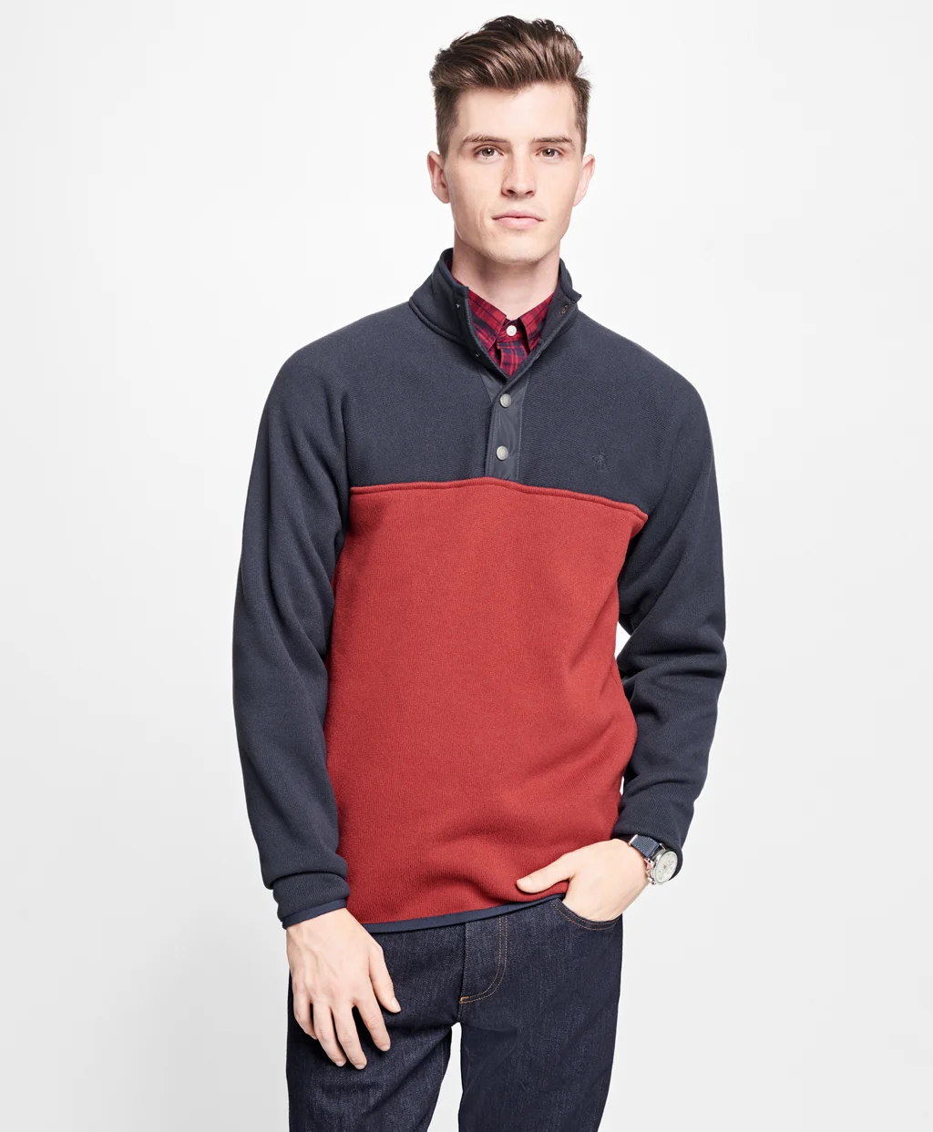 The duofold fabrication technique plates two layers of fabric together, trapping a layer of thermal insulation between for superior comfort and warmth. Featured above: color-blocked raglan henley detailed with a four-button placket and contrast pocket tee.